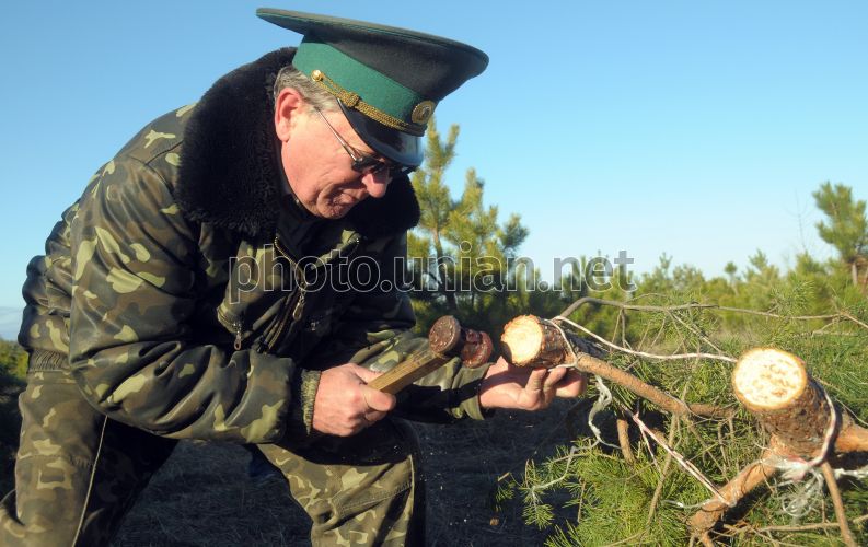 Лісник ставить клеймо на зрубаній для продажу сосні в Чугуєво-Бабчанському лісгоспі в Чугуївському р-ні, Харківської обл., у вівторок, 11 грудня 2012 р. Фото Володимира Андреєва / УНІАН