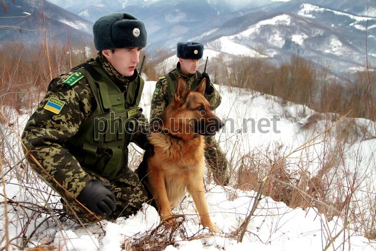 Військовослужбовці Мукачівського прикордонного загону з собакою патрулюють ділянку українсько-румунського кордону в Карпатських горах неподалік від с. Ділове Рахівського району (Закарпатська обл.), в четвер, 7 лютого 2013 р. Фото Яноша Немеша / УНІАН