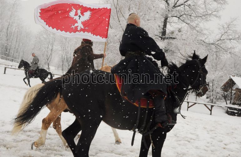 Козаки на конях під час урочистих заходів з нагоди 365-ї річниці обрання гетьманом Богдана-Зиновія Хмельницького в культурно-етнографічному центрі народознавства "Мамаєва Слобода" у Києві, в суботу, 9 лютого 2013 р. У цей день в "Мамаєвій слободі "з нагоди 365-ї річниці обрання гетьманом Богдана-Зиновія Хмельницького відбулося козацьке свято. Також в рамках святкування було оголошено дружній виклик на IV Міжнародний Великий лицарський турнір "Шабля" Козака Мамая ", який відбудеться 6-7 липня 2013 року. Фото УНІАН