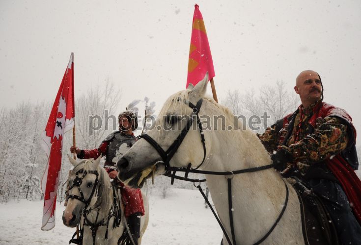 Козаки на конях під час урочистих заходів з нагоди 365-ї річниці обрання гетьманом Богдана-Зиновія Хмельницького в культурно-етнографічному центрі народознавства "Мамаєва Слобода" у Києві, в суботу, 9 лютого 2013 р. У цей день в "Мамаєвій слободі "з нагоди 365-ї річниці обрання гетьманом Богдана-Зиновія Хмельницького відбулося козацьке свято. Також в рамках святкування було оголошено дружній виклик на IV Міжнародний Великий лицарський турнір "Шабля" Козака Мамая ", який відбудеться 6-7 липня 2013 року. Фото УНІАН