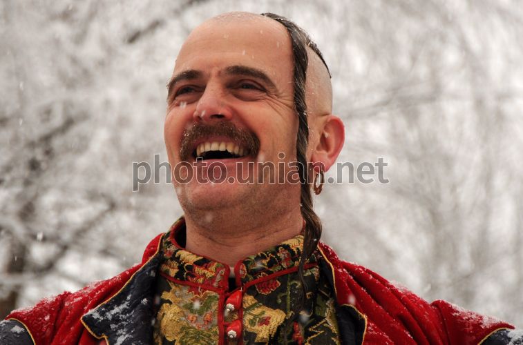 Козак під час урочистих заходів з нагоди 365-ї річниці обрання гетьманом Богдана-Зиновія Хмельницького танцюють в культурно-етнографічному центрі народознавства "Мамаєва Слобода" у Києві, в суботу, 9 лютого 2013 р. У цей день в "Мамаєвій слободі "з нагоди 365-ї річниці обрання гетьманом Богдана-Зиновія Хмельницького відбулося козацьке свято. Також в рамках святкування було оголошено дружній виклик на IV Міжнародний Великий лицарський турнір "Шабля" Козака Мамая ", який відбудеться 6-7 липня 2013 року. Фото УНІАН
