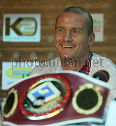 Інтерконтинентальний чемпіон за версією WBO в напівважкій вазі В'ячеслав Узєлков під час прес-конференції перед боєм зі швейцарським боксером Соф'ян Себіхі, у Києві, у середу, 6 березня 2013 р. 16 березня 2013 р. в Києві пройде боксерське шоу компанії братів Кличків "K2 Promotions". В головному поєдинку вечора Інтерконтинентальний чемпіон за версією WBO в напівважкій вазі В'ячеслав Узєлков проведе захист титулу. Фото Володимира Гонтара / УНІАН