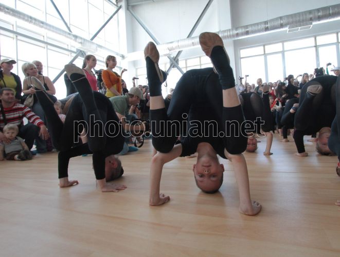 Діти перед початком встановлення національного рекорду "Наймасовіше виконання стійкі на голові" в Києві, у суботу, 27 квітня 2013 р. Фото Євгена Орловського / УНІАН