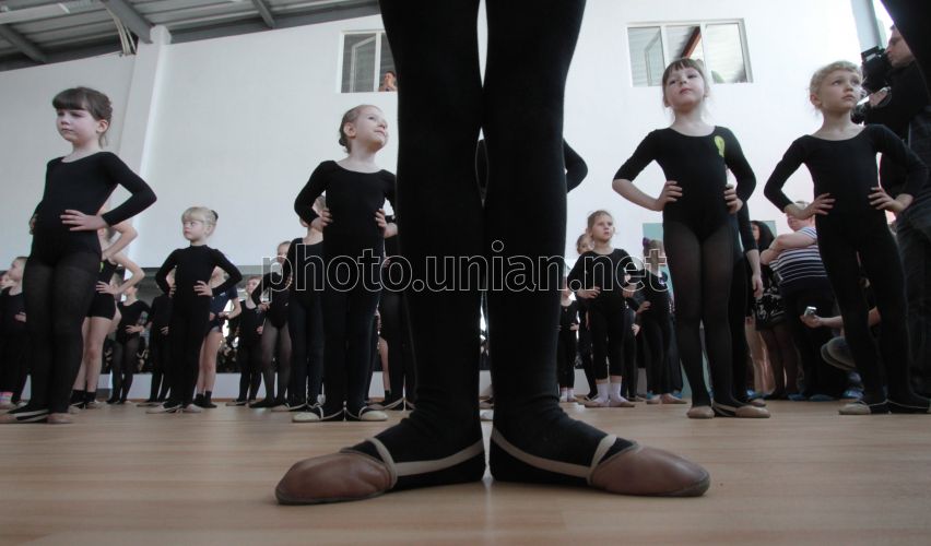 Діти перед початком встановлення двох національних рекордів - "Наймасовіше виконання гімнастичної вправи шпагат" та "Наймасовіше виконання стійкі на голові" в Києві, у суботу, 27 квітня 2013 р. Фото Євгена Орловського / УНІАН