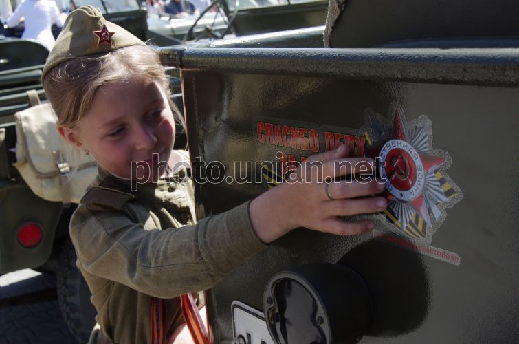 Дівчинка у формі радянського солдата під час акції «Спасибі діду за перемогу!», у Севастополі (Крим), у четвер, 2 травня 2013 р. Цього дня на площі Нахімова стартувала акція «Спасибі діду за Перемогу!». Основна умова акції - прикріпити наклейку на автомобіль. У святкові дні автомобілі з наклейками вітатимуть ветеранів на дорогах Севастополя і Криму. Фото Василя Батанова / УНІАН