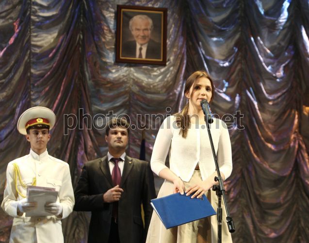 Дочка екс-прем'єр-міністра України Юлії Тимошенко Євгенія, праворуч, зачитує листа від матері під час вручення нагород переможцям Міжнародного конкурсу з української мови ім. Петра Яцика, в Києві, у середу, 15 травня 2013 р. У цей день переможцям Міжнародного конкурсу знавців української мови імені Петра Яцика було вручено премії від лідера опозиції Юлії Тимошенко. Вручила премії від Тимошенко донька лідера опозиції Євгенія. Вона привітала 11 молодих мовознавців та їх наставників з усієї України. Є.Тимошенко також зачитала листа від екс-прем’єра, яка перебуває у харківській лікарні «Укрзалізниці». Фото Олександра Прокопенка / POOL / УНІАН