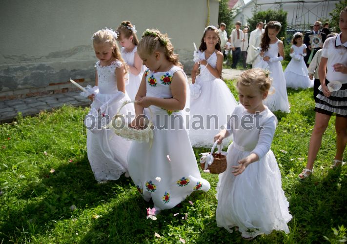 Хресна хода довкола церкви після прийняття першого причастя в м. Миколаїв (Львівська обл.), в неділю, 30 червня 2013 р. Перше Причастя - традиційне для католицької церкви святкування, пов'язане з прийняттям дитиною на літургії вперше таїнства Євхаристії. Перше причастя зазвичай здійснюється в 7 — 12 років, коли дитина досягає «розумного віку», щоб усвідомити велич моменту. Фото УНІАН