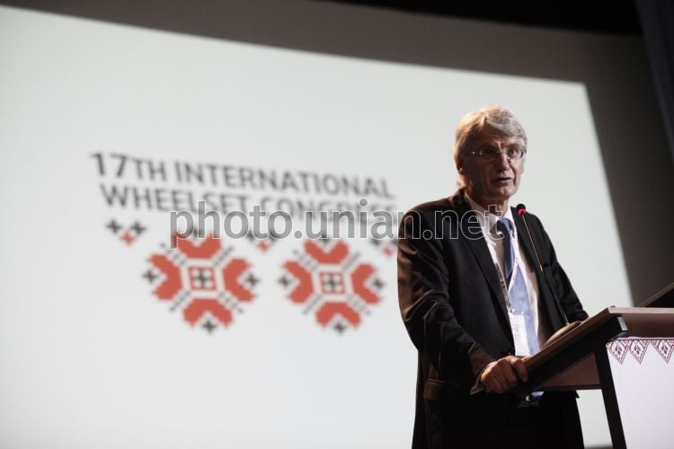 Голова Європейської Асоціації залізничного транспорту UNIFE Раймонд Абелєа виступає під час відкриття 17-го Міжнародного колісного конгресу в Києві, у понеділок, 23 вересня 2013 р. У конгресі беруть участь більш як 300 учасників із 34 країн світу. Конгрес триватиме п'ять днів, упродовж яких експерти-колісники представлять свої доповіді. Основна тематика конгресу: «Нові технології, що продовжують життєвий цикл колісних пар». Міжнародний конгрес із колісних пар було започатковано в 1963 році. З тих пір конгрес відбувається раз на три роки. Фото Євгена Малолєтки / УНІАН
