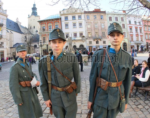 Активісти Учнівського братства, одягнені в стрілецьку уніформу, зі зброєю періоду І Світової війни, під час реконструкції подій з приводу проголошення ЗУНР у Львові, у п'ятницю, 1 листопада 2013 р. Цього дня активісти Учнівського братства, одягнені в стрілецьку уніформу, зі зброєю періоду І Світової війни, відтворили частину подій 1 листопада 1918 року. Фото УНІАН