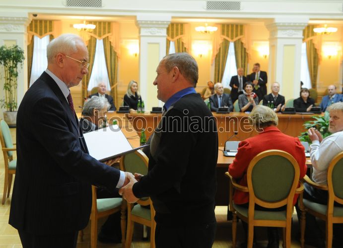 Прем'єр-міністр України Микола Азаров, ліворуч, під час зустрічі з представниками всеукраїнських громадських об'єднань інвалідів у Києві, у вівторок, 12 листопада 2013 р. Цього дня в Києві прем'єр-міністр України Микола Азаров провів зустріч з представниками всеукраїнських громадських об'єднань інвалідів. Фото Олега Маркевича / прес-служба КМУ / POOL / УНІАН