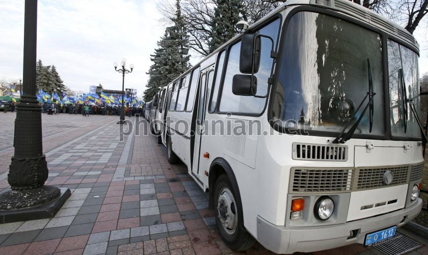 Автобуси із співробітниками міліції під час мітингу прибічників Партії регіонів біля будівлі Верховної Ради України в Києві, в середу, 4 грудня 2013 р. Фото Олександра Синиці / УНІАН