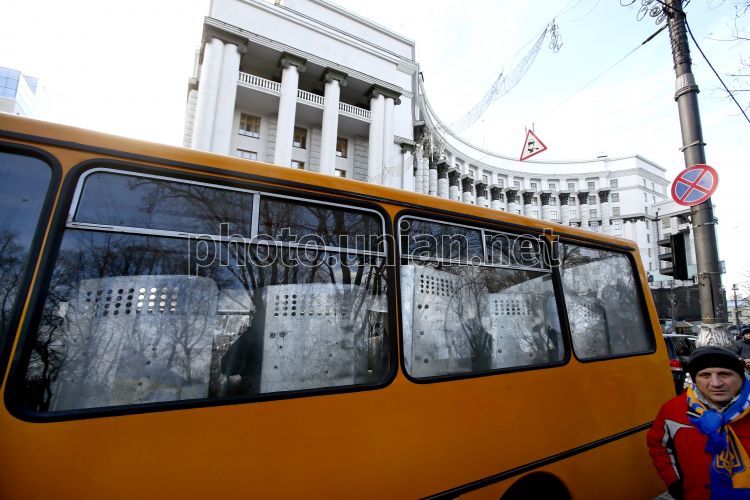 Автобус із співробітниками міліції біля будівлі Кабінету Міністрів України в Києві, в середу, 4 грудня 2013 р. Фото Олександра Синиці / УНІАН