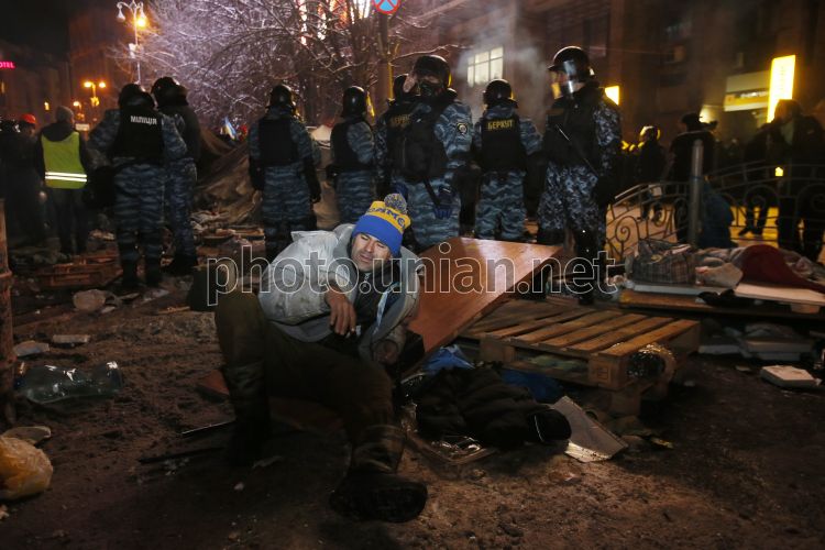 Учасник акції протесту сидить на залишках барикад на Майдані Незалежності, в Києві, в ніч на середу, 11 грудня 2013 р. Силовики - бійці спецпідрозділу "Беркут" та внутрішні війська - спробували штурмувати Євромайдан в Києві та знищити барикади навколо Майдану Незалежності. Учасники акції протесту вистояли під натиском силовиків. МВС назвало штурм Євромайдану "заходами з благоустрою территорії". Фото Володимира Гонтара / УНІАН