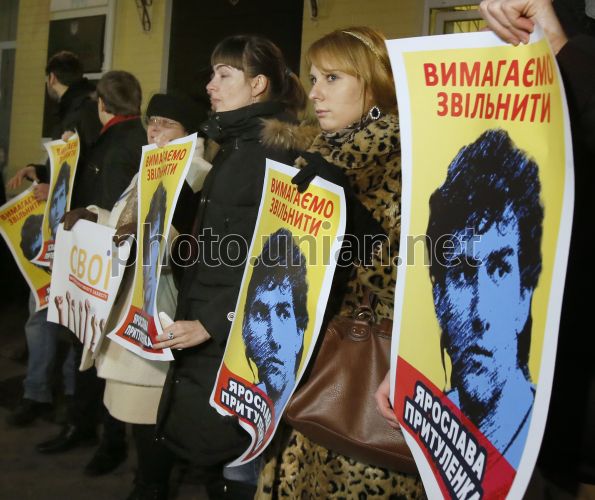 Активісти Євромайдану пікетують Печерський суд Києва з вимогою звільнити "в'язня Банкової" Ярослава Притуленка, у середу, 8 січня 2014 р. Декілька сотень активістів Євромайдану пікетують Печерський районний суд Києва з вимогою звільнити Ярослава Притуленка, арештованого після штурму Адміністрації Президента 1 грудня. Засідання суду тривало не більше 5 хвилин. Сам Притуленко не був доставлений до суду. Жоден представник Генеральної прокуратури теж не з'явився. Фото Олександра Синиці / УНІАН