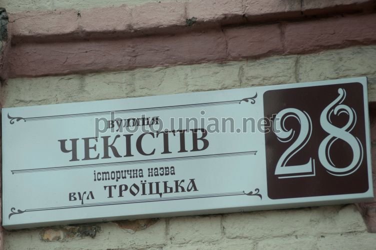 Табличка з назвою вулиці під час презентації адресних табличок з історичними назвами вулиць так званого старого Олександровська (Жовтневий район), у Запоріжжі, в четвер, 13 лютого 2014 р. Разом з діючою назвою вулиці на нових табличках буде вказана перша, історична, назва вулиці. Таблички виконані в стилі початку XX ст. Історичні назви вже з'явилися на вулицях Чекістів (раніше - Троїцька) і Дзержинського (Олександровська). Фото Олександра Прилепи / УНІАН