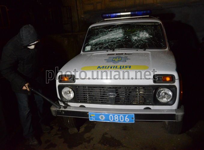 Мітингувальники розбивають міліцейський автомобіль біля Галицького районного відділу міліції у Львові, в ніч на 19 фераля 2014 р. У Львові мітингувальники захопили Галицький райвідділ міліції. Активісти розбили і перевернули кілька міліцейських автомобілів, припаркованих біля входу і увірвалися всередину приміщення через вибиті стекла. Фото Валерія Шмакова / УНІАН