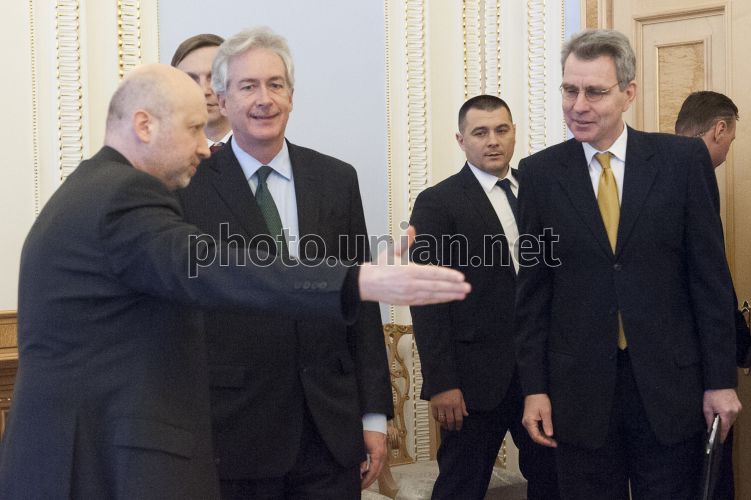 Зліва направо: голова Верховної Ради України, в.о. Президента України Олександр Турчинов, перший заступник державного секретаря США Вільям Бернс, Надзвичайний і Повноважний Посол США в Україні Джеффрі Пайєтт під час зустрічі в Києві, у вівторок, 25 лютого 2014 р. Фото Анастасії Сироткіної / POOL / УНІАН