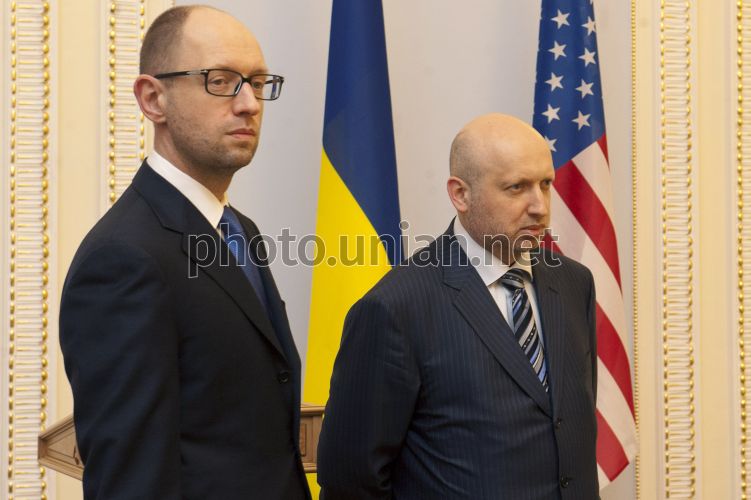 В.о. Президента України, голова Верховної Ради України Олександр Турчинов, праворуч, та прем'єр-міністр України Арсеній Яценюк під час зустрічі з державним секретарем США Джоном Керрі, в Києві, у вівторок, 4 березня 2014 р. Фото Анастасії Сироткіної / POOL / УНІАН