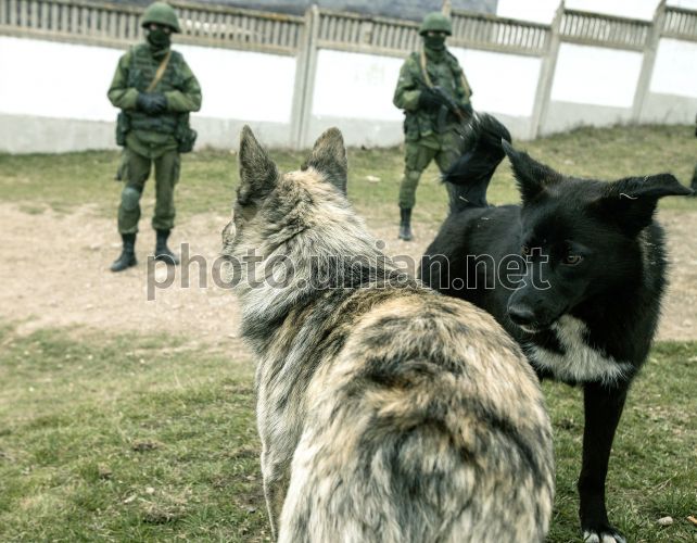 Собаки біля військової частини (А 2320) 36-ої окремої бригади берегової оборони ВМС України в селищі Перевальне (Крим), в четвер, 6 березня 2014 р. Фото Макса Рокотанського / УНІАН
