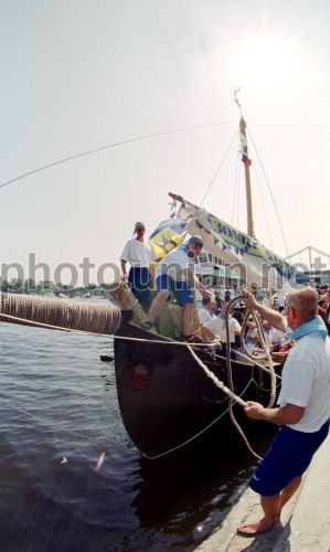 Матрос віддає кінці козацької "Чайки" за назвою "Богун" під час старту науково-дослідної експедиції історичними маршрутами запорізьких козаків у Києві в суботу, 20 липня 2002р. Корабель є точною копією середньовічної "Чайки", уперше після 400-літньої перерви виготовленої за стародавніми технологіями. Учасники експедиції на веслах і під вітрилом пройдуть по Дніпру, через північну частину Чорного моря навколо Криму, через Азовське море до Ростову-на-Дону. Проведена в рамках Національної програми "Рік України в Російській Федерації" експедиція, керівником і капітаном якої є Сергій Воронов, займе 45 днів.