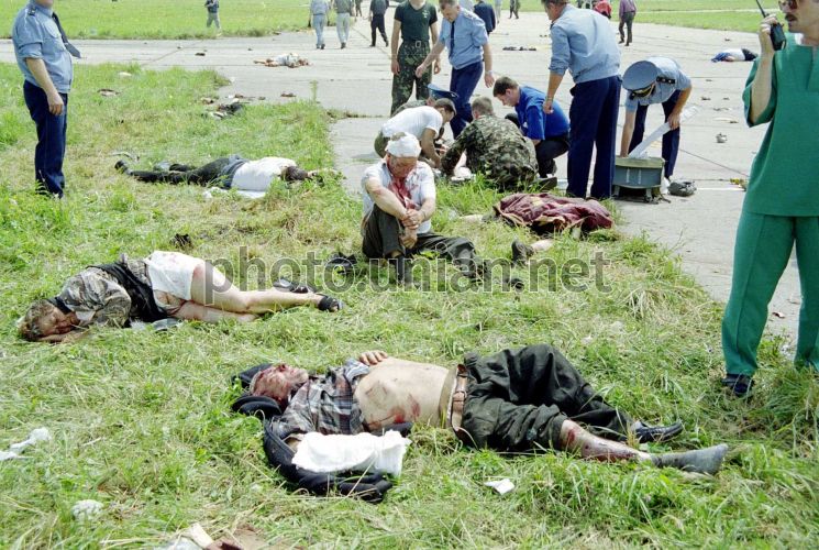 COMM Живі і мертві жертви катастрофи на авіашоу лежать на траві аеродрому Скнилів у Львові в суботу, 27 липня 2002р. У цей день під час шоу, присвяченого 60-річчю 14-го авіаційного корпуса Військово-Повітряних Сил Збройних Сил України, винищувач СУ-27, виконуючи маневри, упав на юрбу глядачів. За інформацією МінНС загинуло не менш 83 осіб і були поранені ще 116. Двоє льотчиків катапультувалися і залишилися живі.