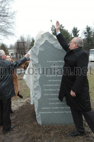 COMM Мер Запоріжжя Євген Карташов, праворуч, та директор Національного заповідника «Хортиця» Костянтин Сушко відкривають пам’ятник, встановлений з нагоди річниці видачі заповідникові Державного акта на право постійного користування землею, в Запоріжжі у вівторок, 23 січня 2007 р. Рішенням Запорізької міської ради у постійне користування Національному заповіднику передана уся земля острова Хортиця, а також прилеглих островів -- Розстебни, Байда, Дубовий, Три Стоги, скелі Середня і Близнюки. Фото Анатолія Мудрика / УНІАН