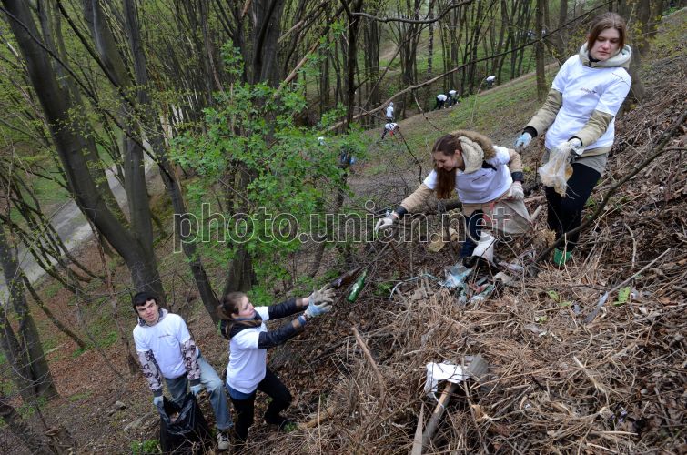 Волонтери прибирають сміття в парку під час загальноміської толоки «Подбаємо про наше місто разом» у Львові, у п'ятницю, 11 квітня 2014 р. Фото Валерія Шмакова / УНІАН