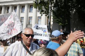 Учасники акції щодо зобов'язань за валютними кредитами перекрили рух транспорту на перехресті вулиць Грушевського і Шовковичної, біля будівлі Верховної Ради України, в Києві, у вівторок, 1 липня 2014 р. Учасники акції вимагають ухвалення законопроекту №4895, а також тримають плакати з написами “Наш закон від Рудьковського”. Фото Володимира Гонтара / УНІАН