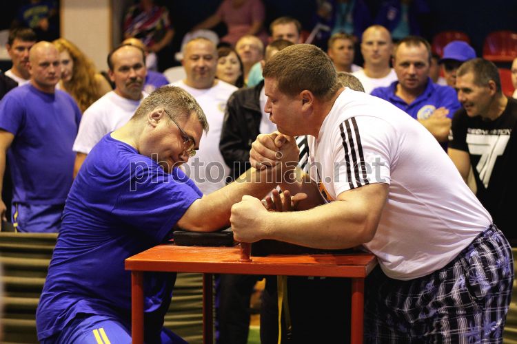 Учасники змагань з армреслінгу в рамках другої Всеукраїнської спартакіади серед інвалідів праці "Сила духу", в Ужгороді, в п'ятницю, 12 вересня 2014 р. В Ужгороді 11 та 12 вересня пройшли фінальні змагання другої Всеукраїнської спартакіади серед інвалідів праці "Сила духу". Фото Яноша Немеша / УНІАН