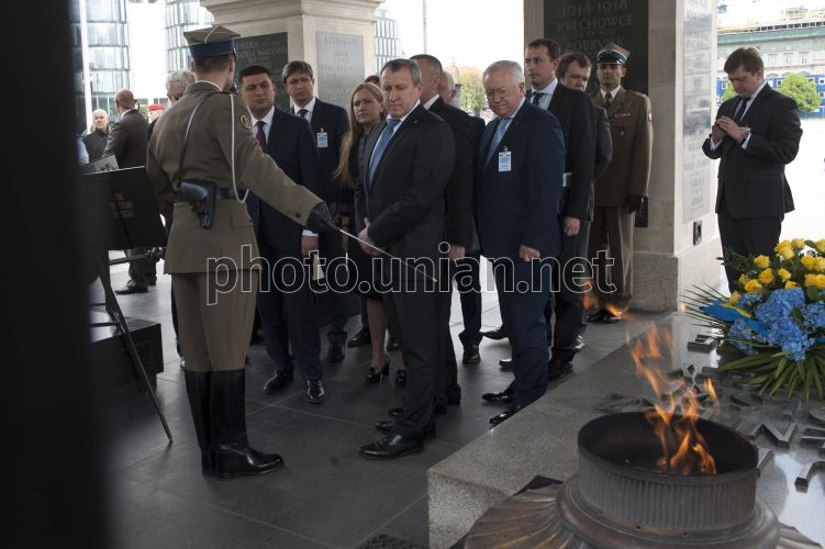 Голова Верховної Ради України Володимир Гройсман та Надзвичайний і Повноважний Посол України в Польщі Андрій Дещиця під час покладання квітів до Могили невідомого солдата у Варшаві (Польща), 29 квітня 2015 р.