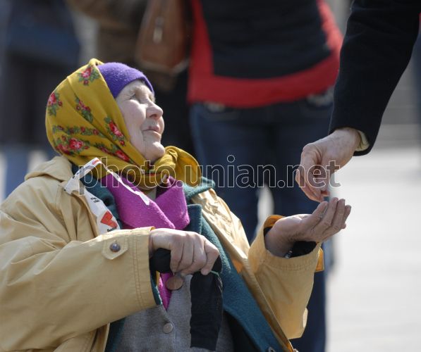 COMM Похила жінка жебракує під час проведення мітингу "Нашої України" на Майдані Незалежності в Києві у суботу, 31 березня 2007 р. Учасники акції зібралися на мітинг з вимогою розпустити Верховну Раду України. Між мітингами опозиції на Майдані Незалежності та мітингу на підтримку уряду, який проходить на Європейській площі, розташовано 4 ряди металевих огорож, уздовж яких щільно стоять співробітники правоохоронних органів.Фото Олега Гордієнка / УНІАН