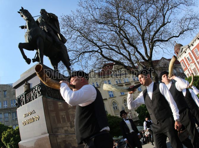Етно-колектив Tovareса muzikа з острова Дугі-Оток в рамках днів хорватської культури у Львові, 3 травня 2015 р. Інструментами музикантів були між іншим роги волів та стародавні праски. Острів'яни здавна використовували ріг вола у своєму побуті, зокрема як засіб зв'язку на морі, а також вірили, що такі звуки оберігають їх від нещастя. Ці давні традиції гурт відроджує ще з 1959 року. Фото УНІАН