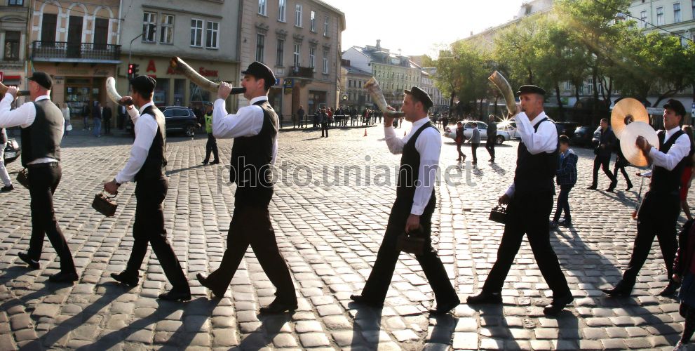 Етно-колектив Tovareса muzikа з острова Дугі-Оток в рамках днів хорватської культури у Львові, 3 травня 2015 р. Інструментами музикантів були між іншим роги волів та стародавні праски. Острів'яни здавна використовували ріг вола у своєму побуті, зокрема як засіб зв'язку на морі, а також вірили, що такі звуки оберігають їх від нещастя. Ці давні традиції гурт відроджує ще з 1959 року. Фото УНІАН