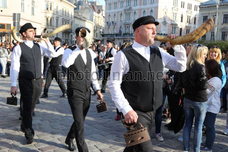 Етно-колектив Tovareса muzikа з острова Дугі-Оток в рамках днів хорватської культури у Львові, 3 травня 2015 р. Інструментами музикантів були між іншим роги волів та стародавні праски. Острів'яни здавна використовували ріг вола у своєму побуті, зокрема як засіб зв'язку на морі, а також вірили, що такі звуки оберігають їх від нещастя. Ці давні традиції гурт відроджує ще з 1959 року. Фото УНІАН