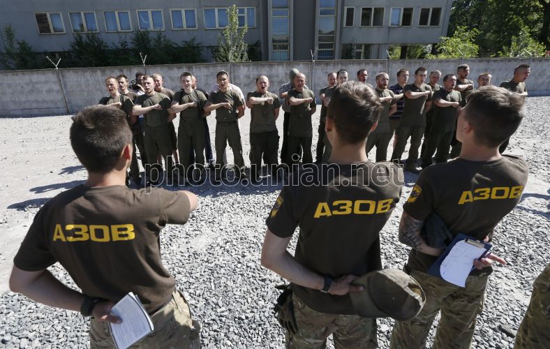 Бійці полку "Азов" у відбірковому таборі полку "Азов", в Києві, 13 червня 2015 р. "Азов Спартан" - останнє випробування, що проходять новобранці у відбірковому таборі полку "Азов". Фото Мусієнко Владислав / УНІАН