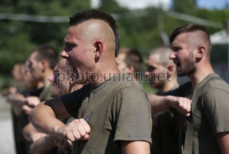 Бійці полку "Азов" у відбірковому таборі полку "Азов", в Києві, 13 червня 2015 р. "Азов Спартан" - останнє випробування, що проходять новобранці у відбірковому таборі полку "Азов". Фото Мусієнко Владислав / УНІАН