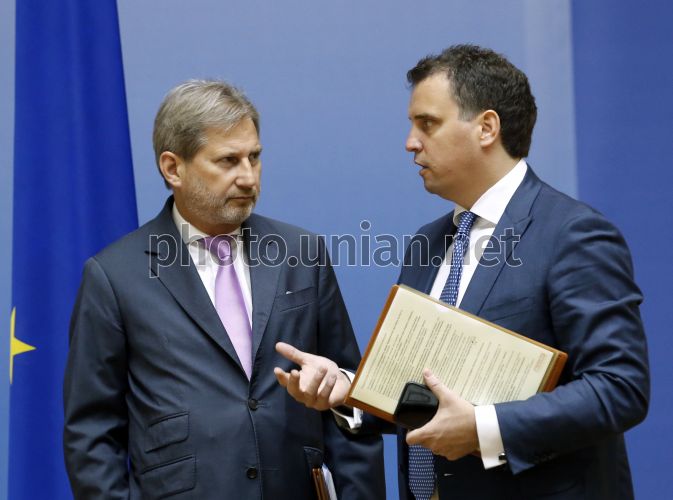 Міністр економічного розвитку і торгівлі України Айварас Абромавичус та комісар ЄС з питань європейської політики сусідства, розширення та переговорів Йоганнес Ган під час підписання Меморандуму про взаєморозуміння щодо програми ЄС з підтримки малого та середнього бізнесу в Україні, в Києві, 18 червня 2015 р. Фото Мусієнко Владислав / УНІАН
