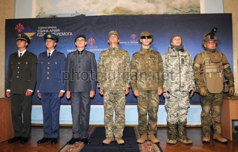 Нові зразки повсякденної, парадно-вихідної форми військовослужбовців під час зустрічі президента України з "волонтерським десантом" Міністерства оборони України, в Києві, 27 липня 2015 р. Цього дня волонтери представили главі держави свої досягнення у забезпеченні війська, зокрема, у реформуванні речового забезпечення та нової військової форми. Фото Колесник Євген / УНІАН