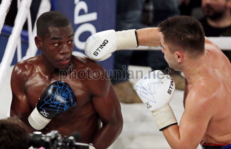 Український боксер-любитель Дмитро Митрофанов і боксер-любитель з Еквадору Марло Дельгадо під час бою в рамках серії AIBA Pro Boxing (APB) у Києві, 12 грудня 2015 р. Фото Соловйов Валерій / УНІАН