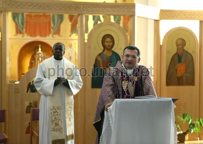Отець Самуель Сакаба (Нігерія) та настоятель римо-католицької парафії св. Йоана Павла ІІ у Львові та в’язничний капелан Римо-католицької Церкви в Україні отець Григорій Драус провели реколекції з африканськими студентами-католиками напередодні Різдва, у Львові, 20 грудня 2015 р. Фото Кравс Євгеній / УНІАН