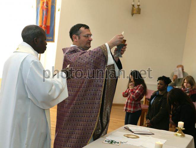 Отець Самуель Сакаба (Нігерія) та настоятель римо-католицької парафії св. Йоана Павла ІІ у Львові та в’язничний капелан Римо-католицької Церкви в Україні отець Григорій Драус провели реколекції з африканськими студентами-католиками напередодні Різдва, у Львові, 20 грудня 2015 р. Фото Кравс Євгеній / УНІАН