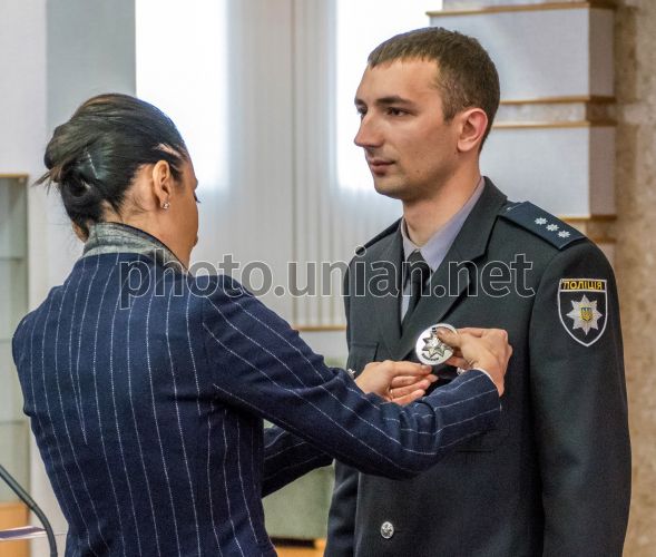 Керівник Національної поліції України Хатія Деканоїдзе вручає спеціальний жетон одному з працівників поліції України, які першими успішно пройшли атестацію в ряди Нацполіції, у Києві, 29 грудня 2015 р. Фото Фалін Володимир / УНІАН