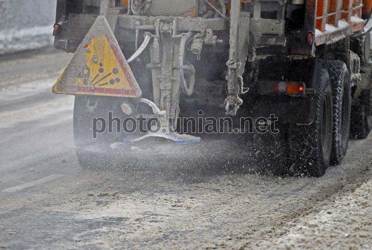 Снігоприбиральна машина на одній з вулиць у Києві, 8 січня 2016 р. В усіх районах столиці тривають роботи з механізованого та ручного прибирання вулично-дорожньої мережі від снігу.