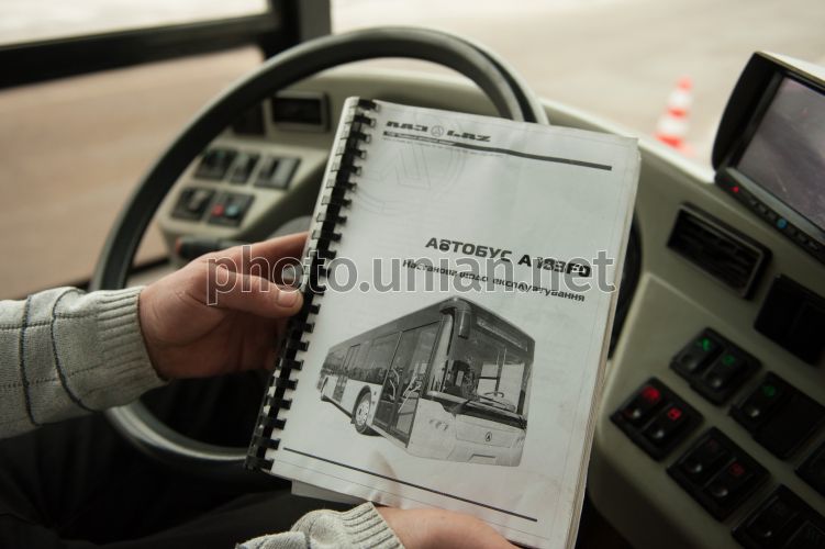 Водій автобуса "ЛАЗ А183" тримає в руках інструкцію з експлуатації у Запоріжжі, 27 січня 2016 р. У Запоріжжі було презентовано автобус "ЛАЗ А183", який буде працювати на 72-му маршруті. Всього запорожців обслуговують 13 таких автобусів виробництва Львівського автозаводу. Фото Прилепа Олександр / УНІАН