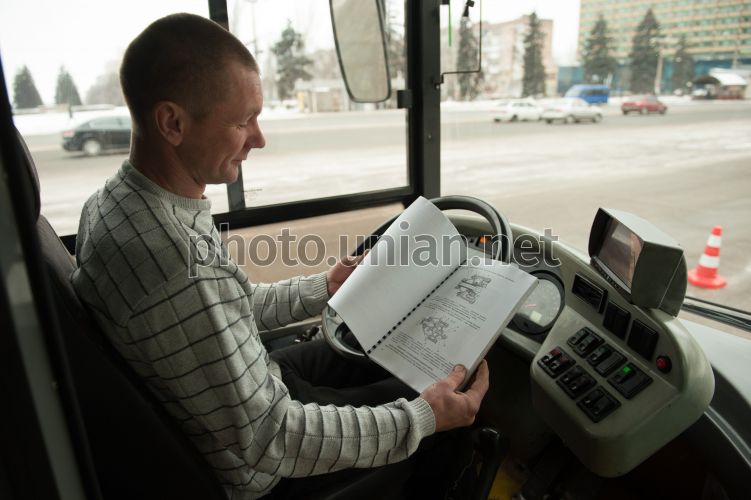 Водій автобуса "ЛАЗ А183" тримає в руках інструкцію з експлуатації у Запоріжжі, 27 січня 2016 р. У Запоріжжі було презентовано автобус "ЛАЗ А183", який буде працювати на 72-му маршруті. Всього запорожців обслуговують 13 таких автобусів виробництва Львівського автозаводу. Фото Прилепа Олександр / УНІАН