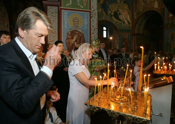 COMM Президент України Віктор Ющенко та його дружина Катерина ставлять свічки під час святкового богослужіння до дня Святої Трійці в Михайлівському соборі в Києві в неділю, 27 травня 2007 р. Цього дня християнська церква у всьому світі відзначає свято П’ятидесятниці - зішестя на апостолів Святого Духу у вигляді вогненних язиків, що відбулося в старозавітне свято П’ятидесятниці - на 50-й день після іудейського Великодня. Це свято називається також Днем Святої Трійці. Остання назва пояснюється тим, що зішестям Святого Духу на апостолів відкрилася конструктивна діяльність третьої Особи Пресвятої Трійці, і вчення Господа Ісуса Христа про Триєдиного Бога і участь Трьох Осіб Божества в Домобудівництві порятунку людського роду досягло досконалої ясності і повноти. На Трійцю прийнято прикрашати храми і будинки вітками дерев, травою і квітами. На цей звичай могло мати вплив і явище Бога у вигляді трьох мандрівників прабатьку Авраму у дуба Мамврійського, де була куща (шатер) патріарха. Тепер молода зелень і квіти не тільки символізують приношення Богу початків весни, що поновлюється, але і саму Церкву Христову, яка проквітнула, по слову церковного співу, яко крін (квітка), а також указує на оновлення людей Духом Святим. Фото Михайла Марківа / POOL / УНІАН