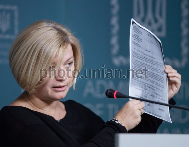 Уповноважений президента з питань мирного врегулювання на Донбасі, представник України в гуманітарній підгрупі Тристоронньої контактної групи, народний депутат України Ірина Геращенко під час брифінгу в Києві, 22 березня 2016 р. Фото Марків Михайло / POOL / УНІАН