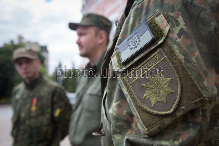 Шеврон на рукаві форми бійця полку поліції особливого призначення "Київ" під час прес-конференції щодо відмови співробітників Нацполіції захищати учасників гей-параду, біля входу до Головного управління Національної поліції у Києві, 7 червня 2016 р. Фото Соколовська Інна / УНІАН