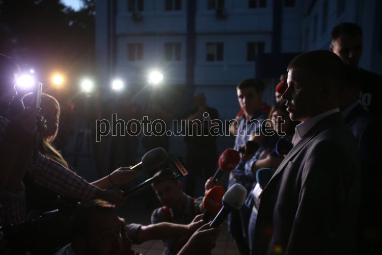 Керівник Києво-Святошинської прокуратури Юрій Дмитрунь дає інтерв'ю журналістам біля Дорожньої клінічної лікарні №2 ст. Київ ДТГО Південно-західної залізниці, у Києві, 4 липня 2016 р. Фото Гонтар Володимир / УНІАН