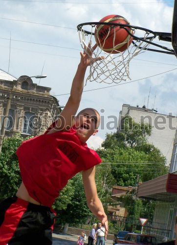 COMM Спортсмен закидає м'яч в кільце під час гри зі стрітболу біля Парку культури і відпочинку в Бердичеві (Житомирська область) в неділю, 24 червня 2007 р. Цього дня в Україні святкували День Молоді. Фото Володимира Соболя / УНІАН